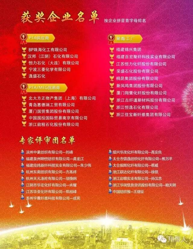 本次獲獎(jiǎng)的企業(yè)不僅在“第十五屆中國(guó)杭州化纖論壇”現(xiàn)場(chǎng)被授予2015年度中國(guó)聚酯業(yè)十佳供應(yīng)商證書,還將享有在中國(guó)化纖信息網(wǎng)及CCFgroup“中國(guó)聚酯十佳供應(yīng)商”欄目進(jìn)行圖標(biāo)鏈接,有助于樹(shù)立良好的企業(yè)品牌形象和收獲更多的社會(huì)影響力。